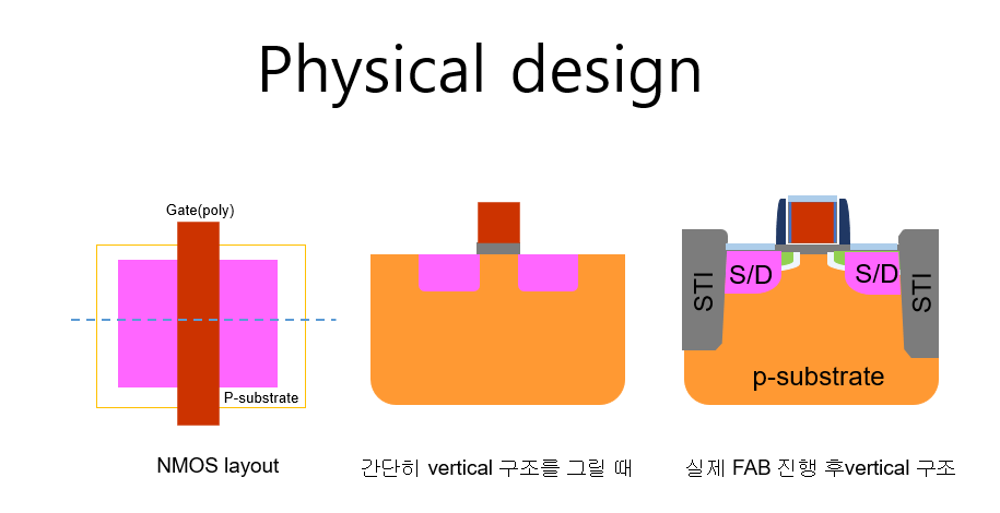 레이아웃을 다른 말로 흔히 physical design 이라고도 한다.회로 설계가 회로의 logic 동작에 중점을 둔 설계라면, 레이아웃은 이렇게 설계된 회로를 wafer에 실제 물리적인 모양으로 구현하는 업무이기 때문이다.레이아웃이 완료되면 레이아웃 DB는 GDS 혹은 OASIS 포맷의 파일로 전달이 되는데, 이 파일들은 각 레이어 별로 wafer 위에 프린트 할 수 있는 mask(사진의 필름에 해당)로 제작되어 FAB에 전달되고, FAB에서는 이 mask를 사용하여 implant,etch,grow 등의 과정을 실행하게 된다. 반도체 공정을 알아야 하는 이유 반도체는 기본적으로 wafer 위에 레이아웃 된 각각의 레이어가 한 층씩 쌓아 올려진 입체적인 구조이다.그런데 공정이 진행되고 난 후 wafer ..